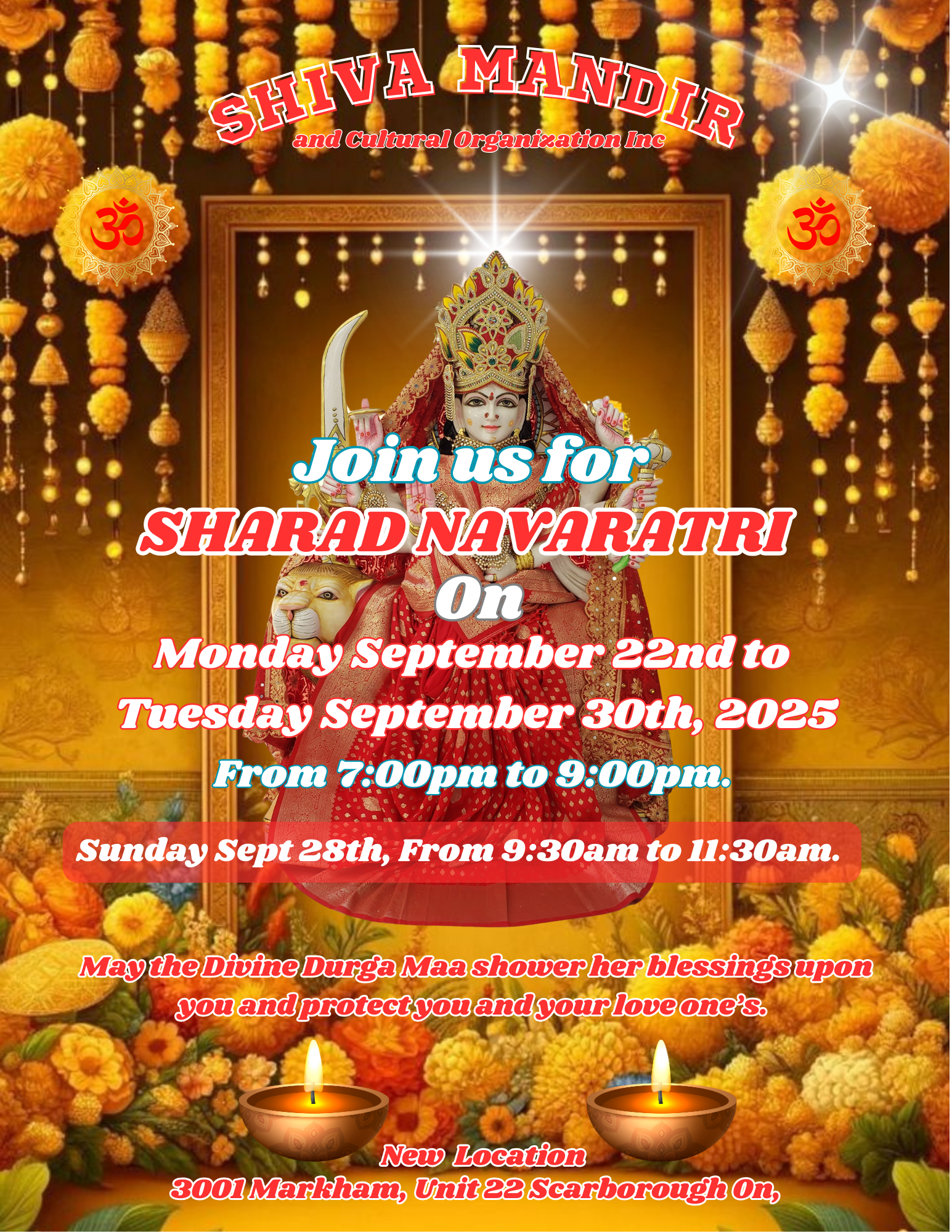 Shiva Mandir invites you and you loved one’s for 9 Session of NAVRATRI.We look forward to you all joining us at the Mandir as we Celebrate this Wonderful Occasion, Puja and Satsang and Abhishek